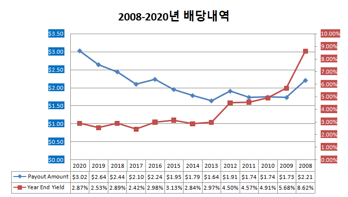 하지만, 배당 ETF이고 ETF 장점은 모든 종목이 배당컷 하지 않는 이상 배당이 계속 지속 된다는 것으며, SDY는 배당귀족주 모두가 포함되어 있으며, 배당컷은 물론이고 배당삭감도 거의 하지 않아 2020년도의 배당 지불금액은 작년과 비교시 높은 편입니다.