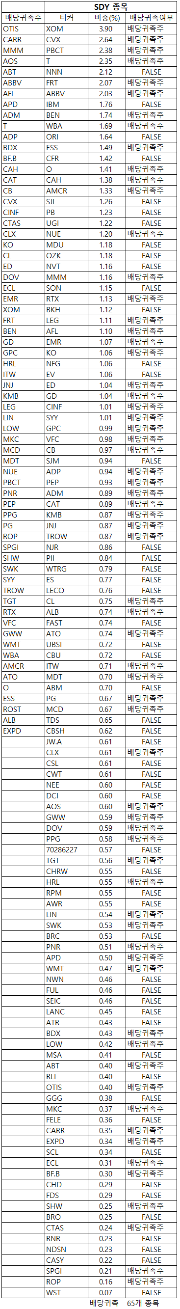 SDY는 2020년 05월 기준의 배당귀족주 거의가 포함된 ETF 입니다.