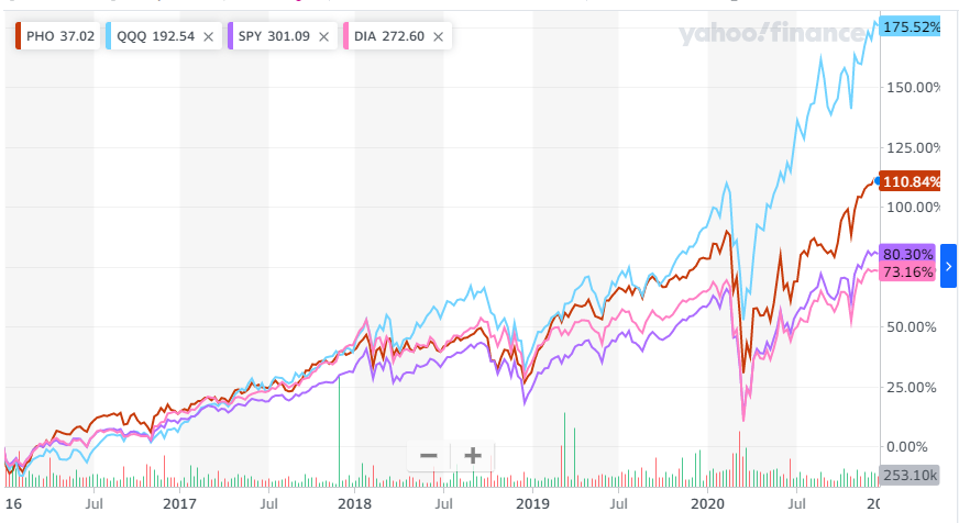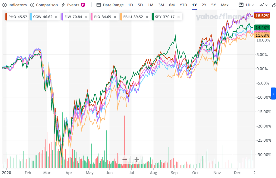 PHO와 FIW의 주가 상승이 다른 ETF에 비해 높으며, S&P 500 ETF인 SPY 보다 주가가 더 많이 올랐습니다.
