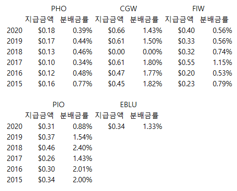 invesco의 PHO, CGW, PIO와 First Trust의 FIW, Tortoise의 EBLU 입니다.