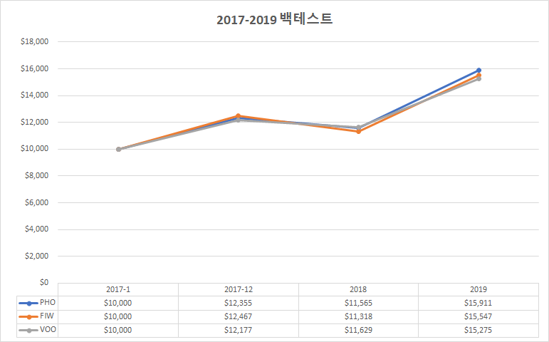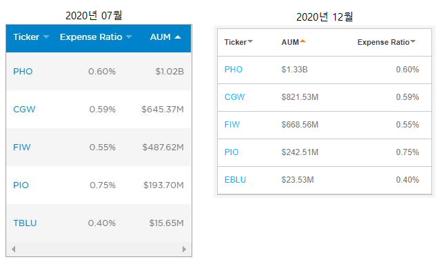 유동성과 자산 측면에선 PHO가 유리하지만, 수익률 측면에서 본다면 FIW가 우수합니다.