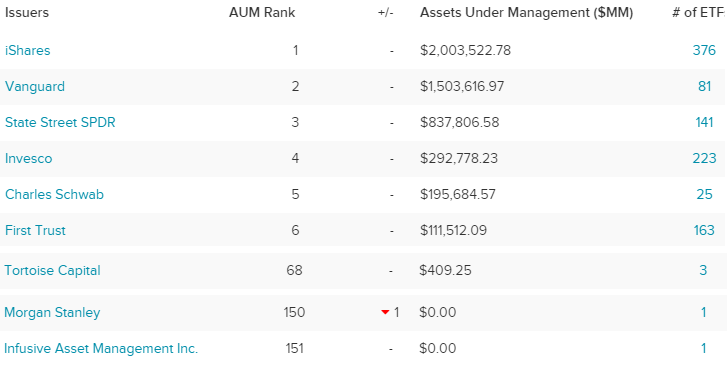 관리자산순으로 운영사의 순위를 줬을때, Tortouse는 68위의 운용사 이며, First Tust는 6위 Invesco는 4위의 운용사 입니다.