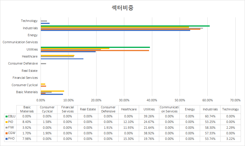 PHO는 기술섹터 비중과 헬스케어 비중이 다른 ETF에 비해 제일 높습니다.