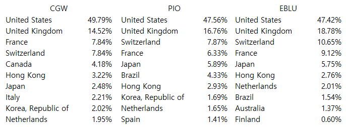 검토일 당시 Global Water 지수를 추종하는 CGW, PIO엔 한국 기업인 코웨이(COWAY Co., Ltd.)가 모두 포함되어 있습니다.