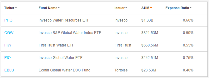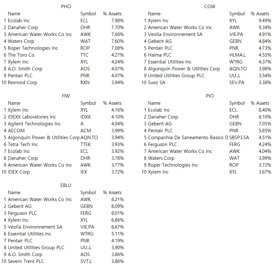 invesco의 PHO, CGW, PIO와 First Trust의 FIW, Tortoise의 EBLU 입니다.