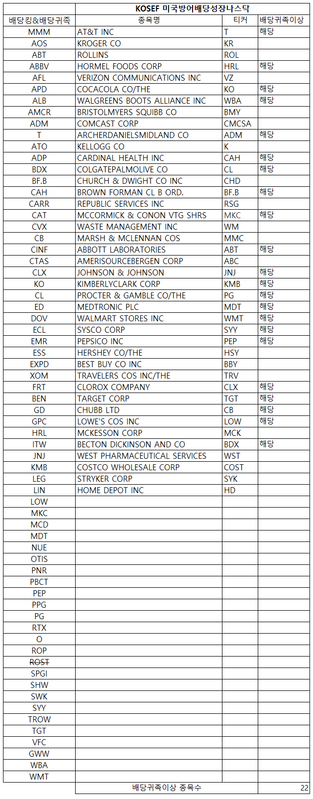 배당킹 및 배당귀족 종목 약 66개 중 네이버금융 종목데이터 기준 22개의 종목이 포함되어 있습니다.