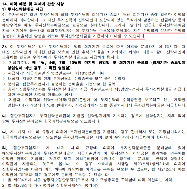 | 분배금 지급기준일 | 1, 4, 7, 10월 마지막 영업일 및 회계기간 종료일 |