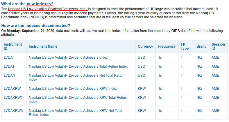 | 지수명 | Nasdaq US Low Volatility Dividend Achievers Index |