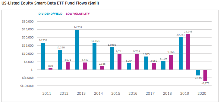 지난 9년간의 데이터를 보면 변동성이 큰 2020년을 제외하곤 저변동성지수의 자금 흐름이 점점 좋아 지고 있습니다.