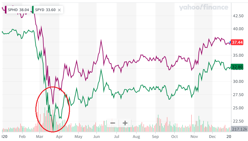 코로나 하락장에서 저변동 ETF인 SPHD보다 고배당 ETF인 SPYD의 주가 하락이 좀 더 컸으며, 회복정도도 SPHD가 좀 더 좋긴 했습니다.