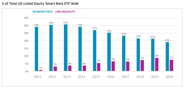 하지만 저변동지수는 변동성이 적은 종목을 포함하여 관리자산이 증가하는 경향을 보인다는 그래프입니다.