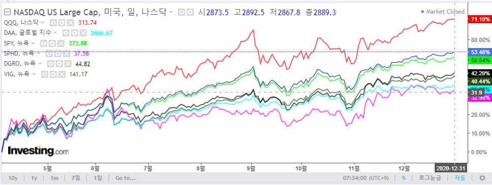 인기있는 S&P 500이나 나스닥-100에 비하면 같은 나스닥 지수라도 배당쪽이라 그런지 거래량은 좋지 못 합니다.