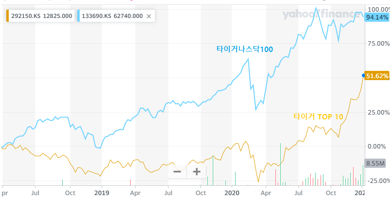 황색이 타이거 TOP10 그래프이며, 파랑색이 타이거 나스닥 100입니다.