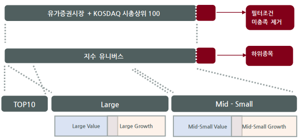 TOP10, 대형가치, 대형성장, 중소형, 중소형가치, 중소형성장과 같은 6개 상품의 ETF를 같은 유니버스로 구성하여 필요지수를 산출하는 방식입니다.