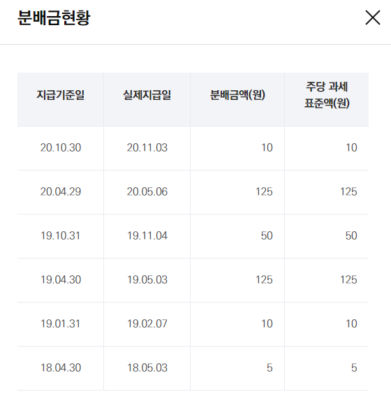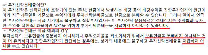 분배금 지급을 일정하지 않습니다. 지급기준일이 1, 4, 7, 10월의 마지막 영업일 및 회계기간 종료일로 되어 있으며, 그 기간에 맞게 월별로 지급 하지만, 하지 않는 달도 있습니다.