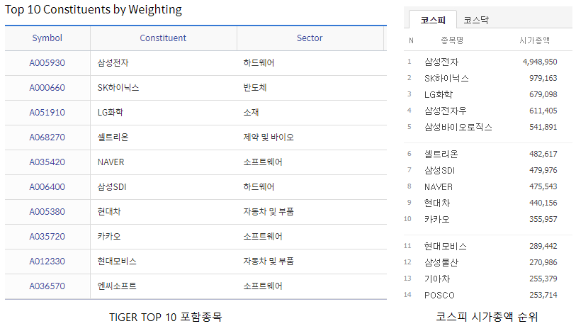 검토일 기준 코스피시가총액이며, 지수에 포함된 종목과 비교시 삼성전자우, 삼성바이오로직스등이 포함되지 않은 걸 확인 할 수 있습니다.