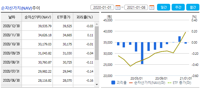 2020년, 1년 월간 괴리율 입니다. 국내상장 해외 ETF에 비해 매우 양호합니다.