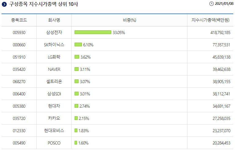 삼성전자나 SK하이닉스, LG화학등 TOP 10 지수와 같은 기업들로 집중이 되기 때문입니다.