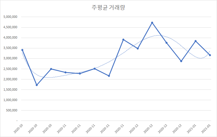 상장일이 얼마안되 주단위 거래량을 봤을때, 일단은 증가추세에 있습니다.