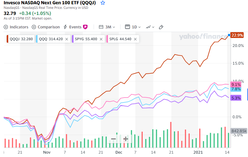QQQ ETF가 시총 100위 기업으로 이루어져 있다면, QQQJ는 그 다음 주자들로 이루어진 ETF 입니다.